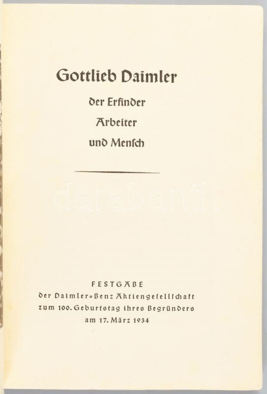 Gottlieb Daimler der Erfinder, Arbeiter und Mensch. Zum seinem 100 Geburtstage. 1934, Daimler-Benz, 1 t.+47 p. + 7 t. Német nyelven. Kiadói papírkötésben, foltos borítóval.