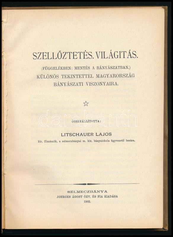 Litschauer Lajos: Légvezetés, szellőztetés, világítás. különös tekintettel Magyarország bányászati viszonyaira. Függelékben: Mentés a bányászatban. A Magyar Bányász-felőr Kézi Könyvtára XI. köt. Selmecbánya, 1902, Joerges Ágost özv. és fia, VIII+143 p.; . Kiadói illusztrált egészvászon-kötés, festett lapélekkel