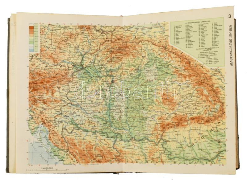 1934 ÁTI kisatlasz. Földrajzi leírás, statisztikai adatok, 56 sokszínű és 155 szövegközti térkép, névmutató 30 ezer helynévvel. Bp., é.n.(1931), Magyar Királyi Állami Térképészet, VIII+176 p.+32 t.(térképek)+156+4 p. (névmutató.) Kiadói félvászon-kötés, kissé sérült gerinccel