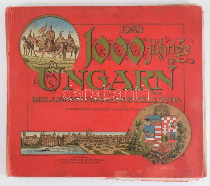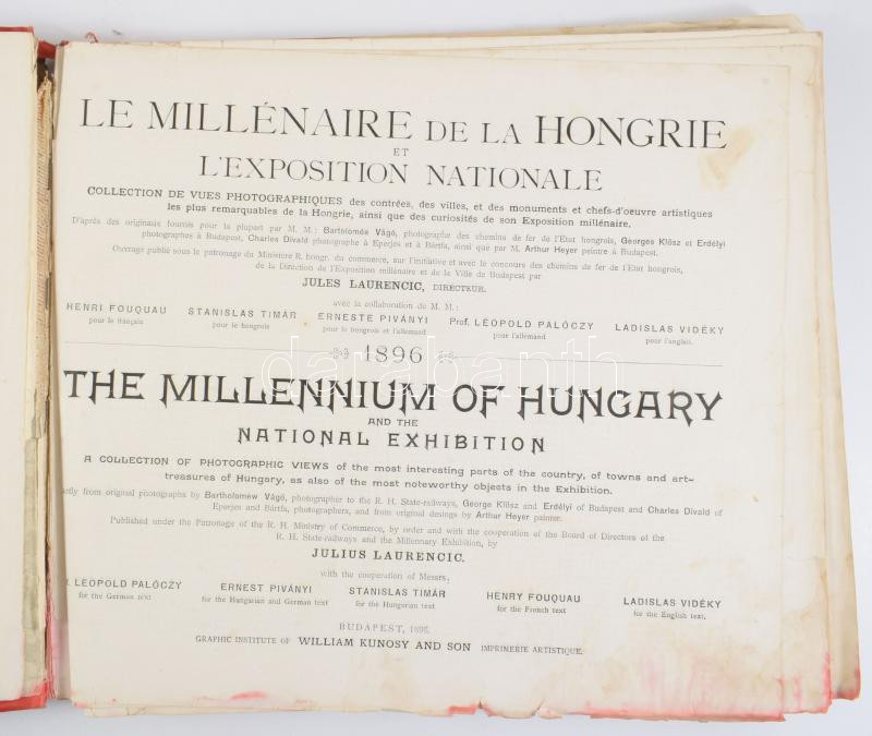 Az ezeréves Magyarország és a milléniumi kiállÃtás. (Das 1000 jährige Ungarn und die Millenniums-Austellung.) Magyarország legszebb tájainak, városainak és műkincseinek valamint a kiállÃtás nevezetességeinek fényképgyüjteménye. Szerk.: Piványi ErnÅ‘, Timár Szaniszló, Palóczy Lipót, Fouquau Henrik, Vidéky László. Kiadja Laurencic Gyula igazgató. Bp., 1896, Kunosy Vilmos és Fia, [4]+192+[2] p. Fekete-fehér képekkel illusztrálva. Magyar, német, francia és angol nyelven. Kiadói illusztrált egészvászon-kötés, szétesÅ‘, rossz állapotban.