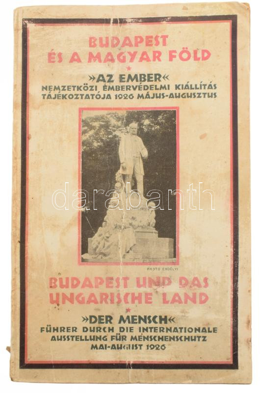 Budapest és a magyar föld. "Az Ember" nemzetközi embervédelmi kiállítás tájékoztatója 1926 május-augusztus. Szerkesztőbizottság elnöke: Dr. Lukács György. Szerk.: Tábori Kornél, Dr. Deutsch Ernő. Budapest und das Ungarische Land. "Der Mensch" Führer Durch die Internationale Ausstellung für Mensschensschutz. Mai-August 1926. Bp., 1926, Globus-ny., 349+3 p. Német nyelven. Fekete-fehér illusztrációkkal. Kiadói papírkötés, kopott, foltos borítóval, foltos lapokkal, hajtásnyommal.