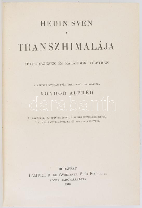 Hedin, Sven: Transzhimalája. Felfedezések és kalandok Tibetben. Ford.: Kondor Alfréd. A Magyar Földrajzi Társaság Könyvtára. Bp., 1910, Lampel R., 1 (cÃmkép) t.+ VI+[2]+330 p.+ 48 t.+ 2 (térképek) t. Kiadói aranyozott egészvászon sorozatkötés, nagyrészt jó állapotban.