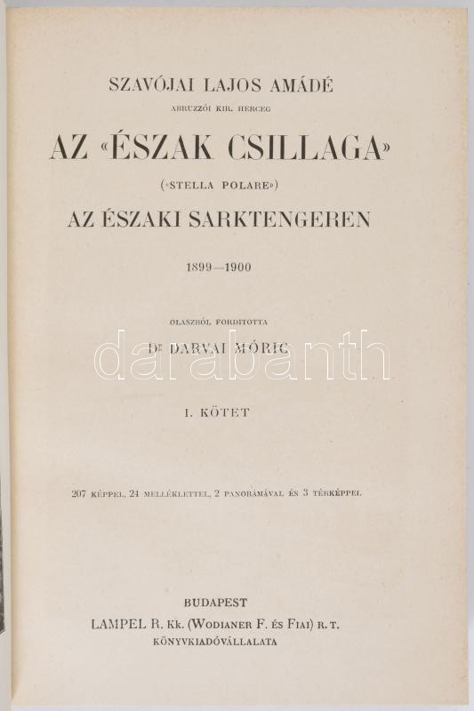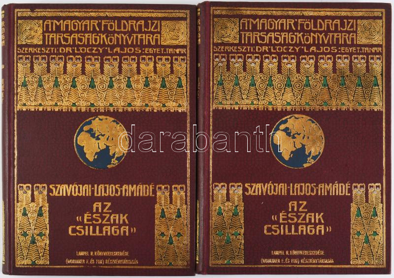 [Luigi Amedeo di Savoia-Aosta, duca degli Abruzzi (1873-1933)] Szavójai Lajos Amádé: Az ,,Észak Csillaga" (,,Stella Polare") az Északi Sarktengeren 1899-1900. Ford.: Darvai Móric. I-II. köt. A Magyar Földrajzi Társaság Könyvtára. Bp., [1904], Lampel R., 218 p.+ 18 t.+ 1 (kihajtható panorámakép) t.; 199+[1] p.+ 6 t.+ 1 (panorámakép) t.+ 2 (térképek) t. Szövegközti és egészoldalas, fekete-fehér képekkel illusztrálva. Kiadói aranyozott egészvászon sorozatkötés, nagyrészt jó állapotban.
