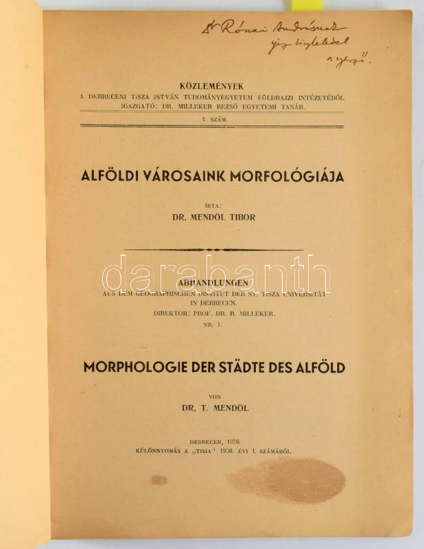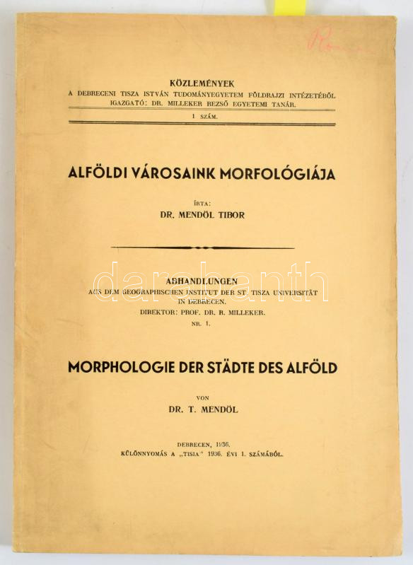 Mendöl Tibor, Dr.: Alföldi városaink morfológiája Debrecen, 1936. Tisia. 44 p., 1 mell. (kihajtható térkép Debrecen). /Közlemények a debreceni Tisza István Tudományegyetem Földrajzi Intézetéből 1./ Fűzve, kiadói papírborítóban