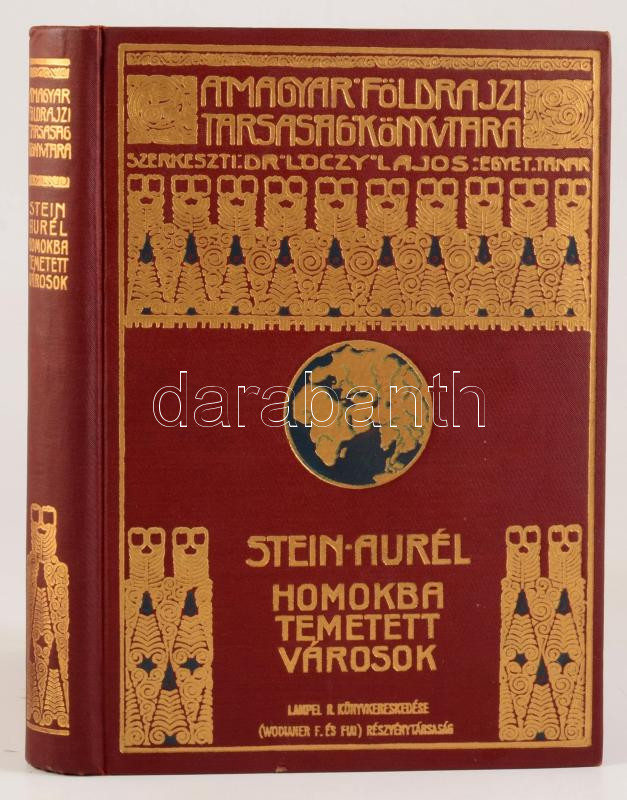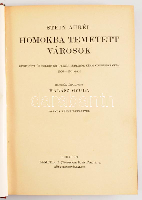 Stein Aurél: Homokba temetett városok. Régészeti és földrajzi utazás Indiából Kelet-Turkesztánba 1900-1901-ben. Ford.: Halász Gyula. A Magyar Földrajzi Társaság Könyvtára. Bp., é.n., Lampel R., 1 (címkép) t.+ 267+[1] p.+ 10 (fekete-fehér képek) t. Kiadói aranyozott egészvászon sorozatkötés, jó állapotban.