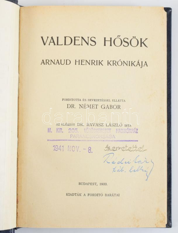 Valdens hősök - Arnaud krónikája. Fordította és bevezetéssel ellátta Dr. Német Gábor. Az előszót Dr. Ravasz László írta. A címlap Buday György fametszőművész munkája. Bp., 1933, magánkiadás. Műbőr kötésben az eredeti borító felhasználásával.