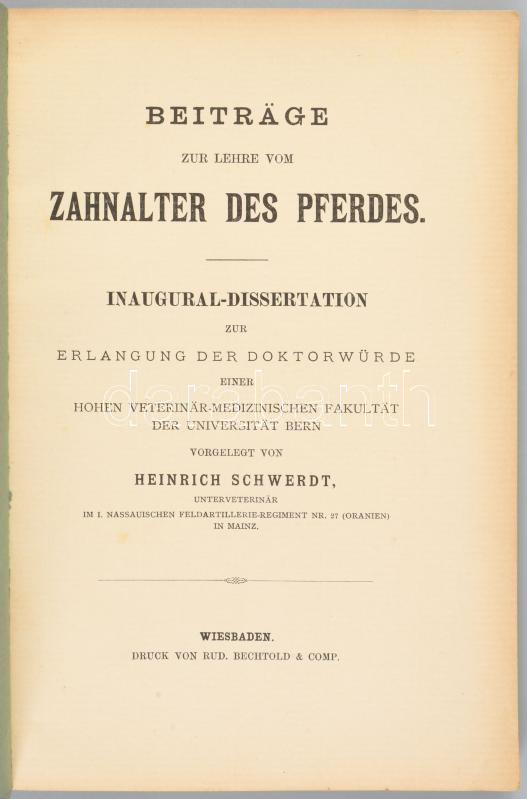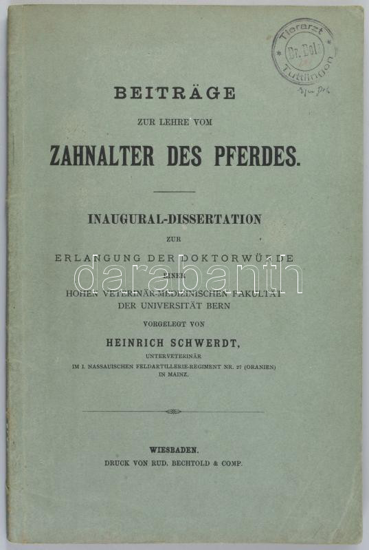 Heinrich Schwerdt: Beiträge zur Lehre vom Zahalter des Pferdes. Inaugural-Dissertation zur Erlangung der Doktorwürde. Wiesbaden,(1909.),Rud. Bechtold & Co. Német nyelven. Kiadói papírkötés.