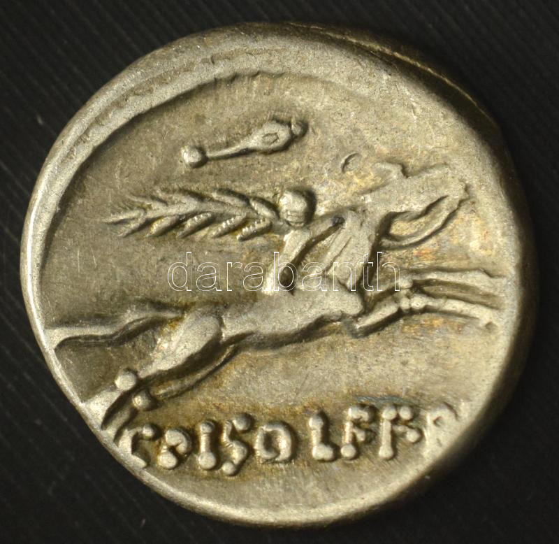 Roman Republic 211 BC Denarius Ag "C PISO F FR[V]" Head of Apollo with laurel wreath / Rider with palm of victory galloping to the right, wreath above. "C. Calpurnius Piso Frugi" (4,02g) T:XF