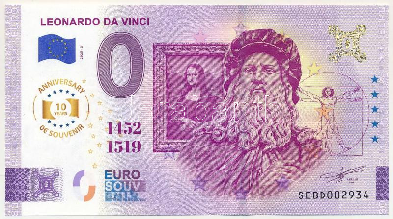 Italy 2025. 0 Euro "Leonardo da Vinci" souvenir banknote "SEBD002934" C:UNC