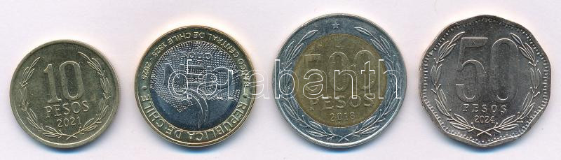 Chile 4db-os forgalmi érme összeállítás 2018. 500P + 2021. 10P + 2024. 50P + 2025. 100P T:AU,XF
