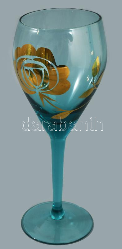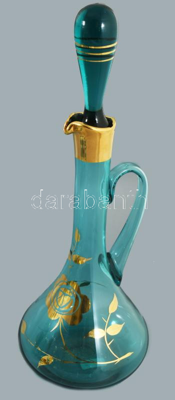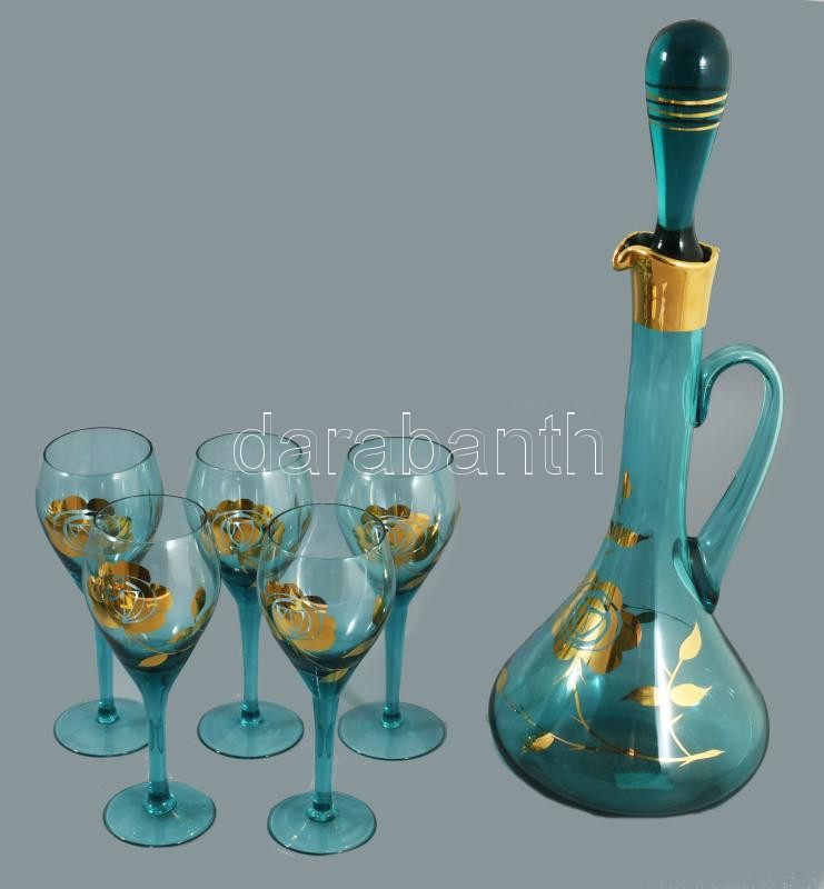 Likőrös készlet 5 pohárral. Aranyozott, anyagában színezett hutaüveg, csiszolt üvegdugóval, hibátlan. Üveg m: 41 cm