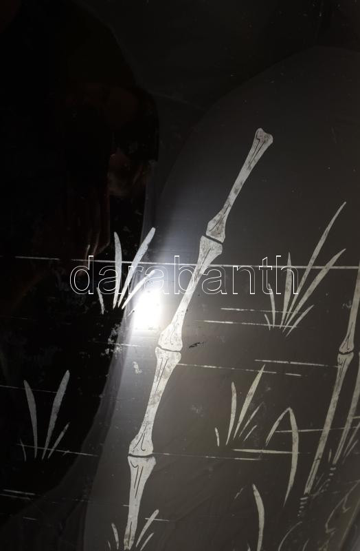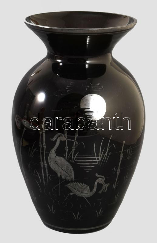 cca 1930/40 Art deco hialitüveg váza, vadászó gémek ábrázolásával, m: 24 cm