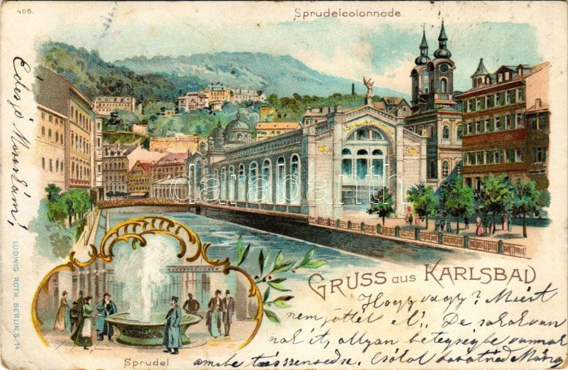 Karlovy Vary, Karlsbad; Sprudelcolonnade, Sprudel / mineral water spring. Ludwig Roth 405. Art Nouveau, floral, litho (EK)