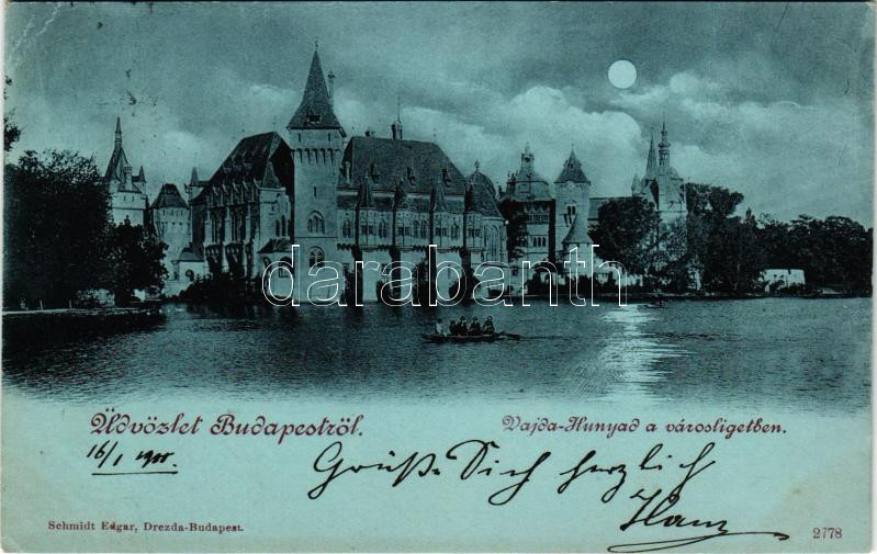 1900 Budapest XIV. Városliget, Vajda-Hunyad vár este holdfényben. Schmidt Edgar kiadása (EB)