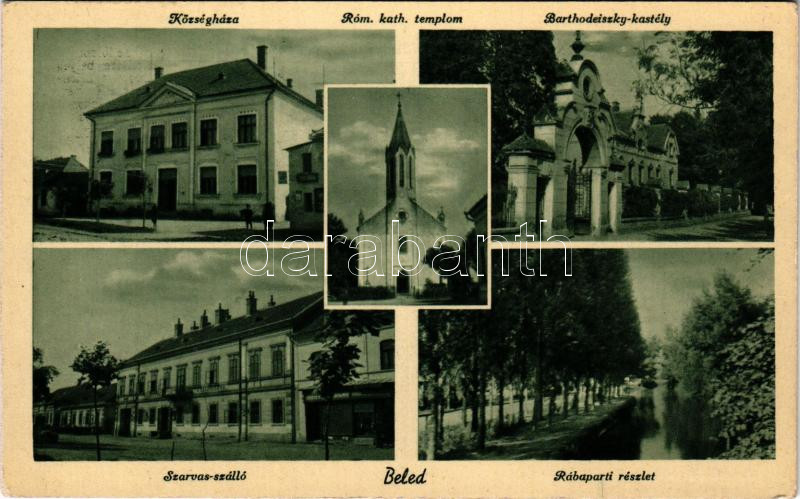 1942 Beled, Községháza, Római katolikus templom, Barthodeiszky-kastély, Szarvas szálló, Rábaparti részlet