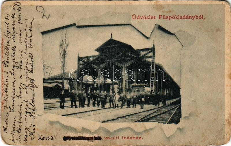 Püspökladány, Vasúti indóház, pályaudvar, vasutasok, létra. Fénynyomat Divald műtintézetéből (Rb)