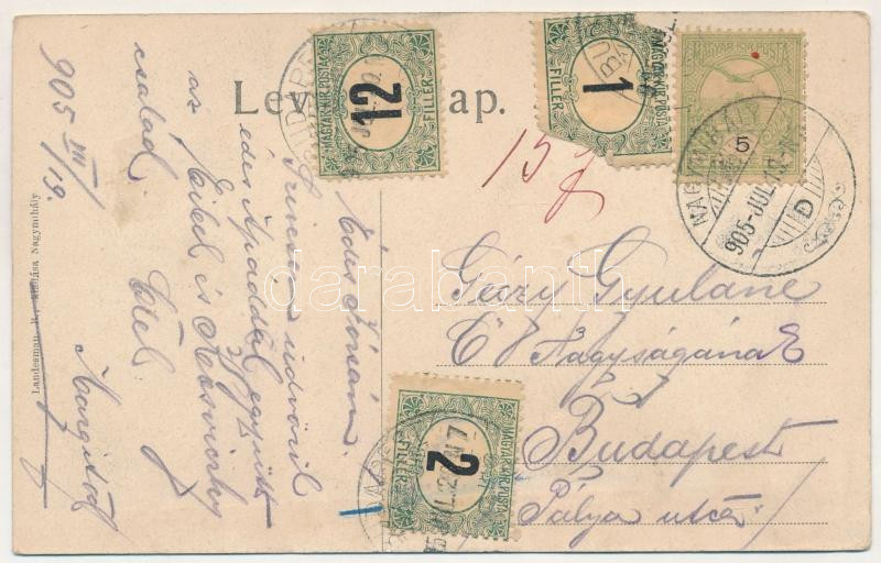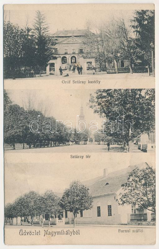 1905 Nagymihály, Michalovce; Gróf Sztáray kastély, Sztáray tér, Barnai szálloda. Landesmann R. kiadása / castle, square, hotel (ázott sarok / wet corner)