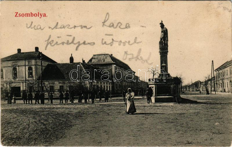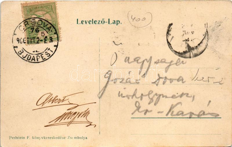 1906 Zsombolya, Hatzfeld, Jimbolia; tér. Perlstein F. kiadása / square + "ORSOVA - BUDAPEST 76. SZ." vasúti mozgóposta bélyegző