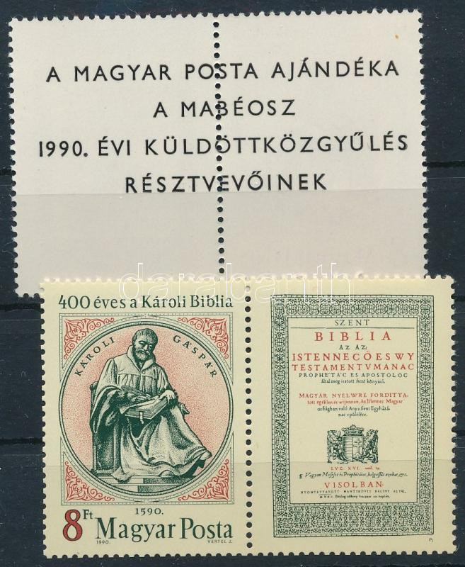 1990 400 éves a Károli Biblia szelvényes bélyeg sima + hátoldalán "A MAGYAR POSTA AJÁNDÉKA A MABÉOSZ 1990. ÉVI KÜLDÖTTKÖZGYŰLÉS RÉSZTVEVŐINEK" felirattal (30.000)
