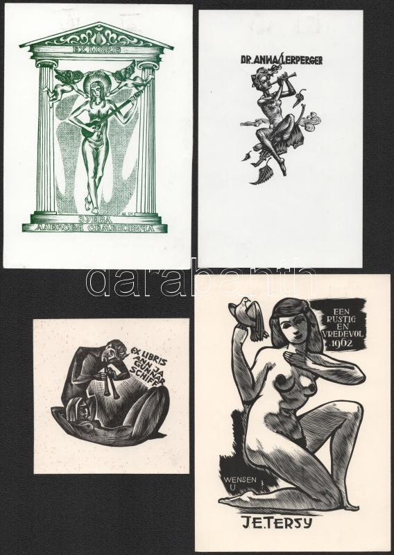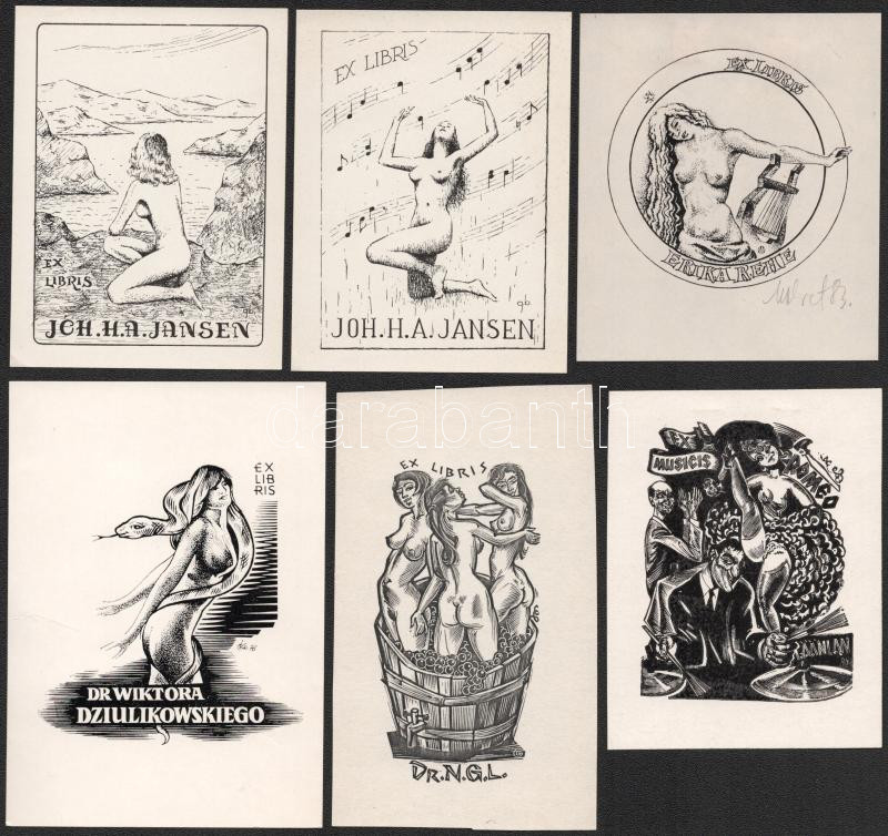 Klf. külföldi alkotók (J. Battermann, Henno Arrak, Richard Kaljo, stb.): 10 db erotikus ex libris és kisgrafika. Klf. technikák, papír, részben jelzett, klf. méretekben.