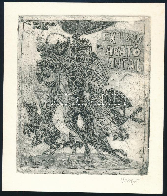 König (Kőnig) Róbert (1951-2014): Ex libris Dr. Arató Antal (Az apokalipszis lovasai). Rézkarc, papír, jelzett, 12,5x10,5 cm