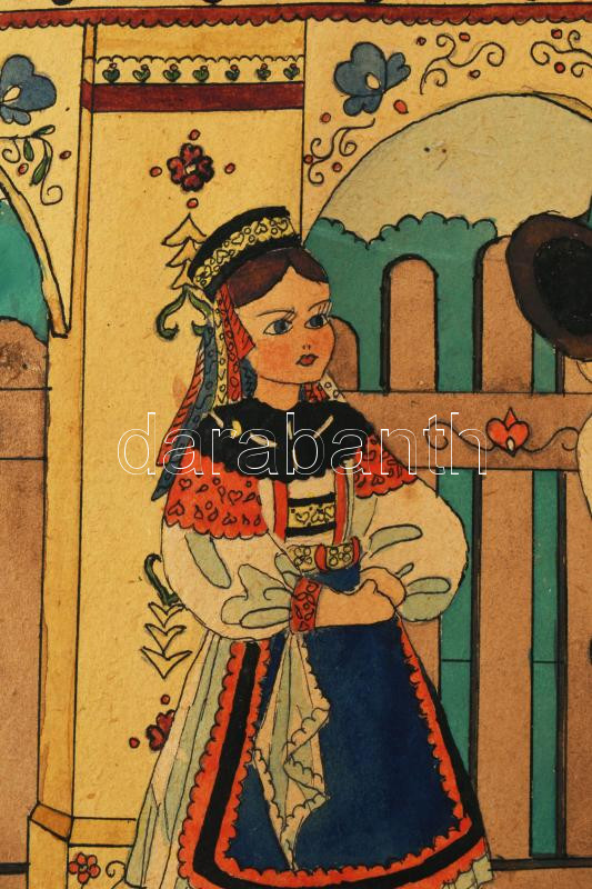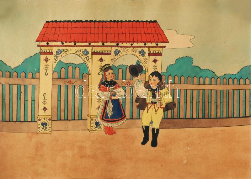 Jelzés nélkül: Népies rajz, ca 1930. Akvarell, papír, sérült, 30x40 cm