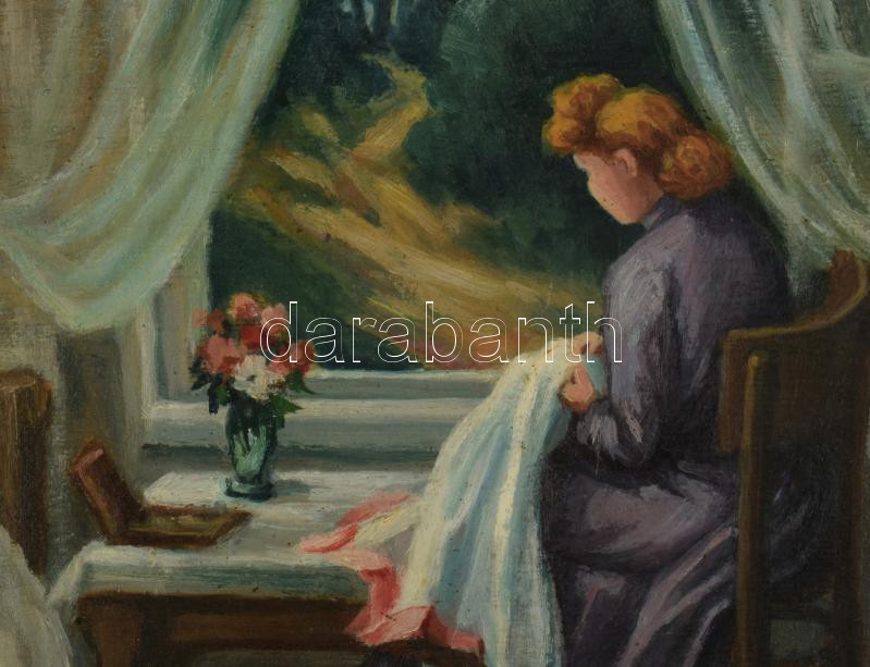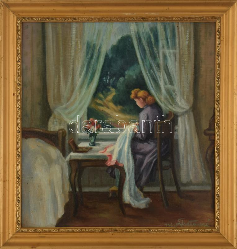 Lisztayné jelzéssel: Hölgy az ablaknál. Olaj, rétegelt lemez. Dekoratív fakeretben, 36,5x35 cm