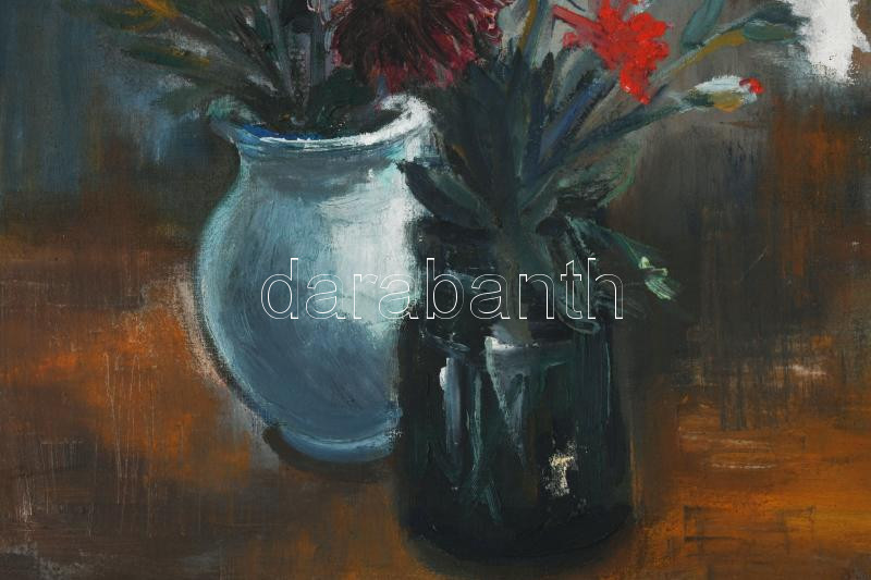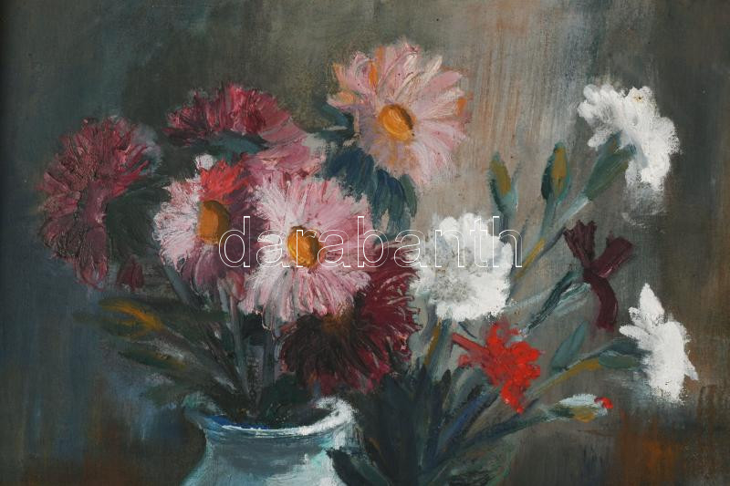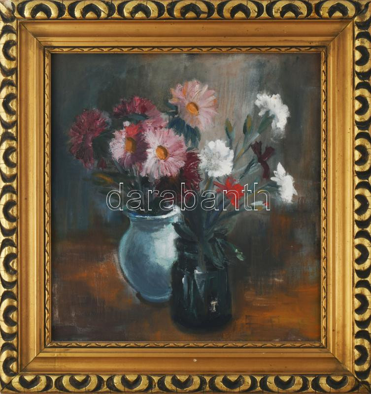 PL jelzéssel (jobbra lent halványan): Csendélet. Olaj, vászon. Dekoratív, kissé sérült fakeretben. 34×32,5 cm.