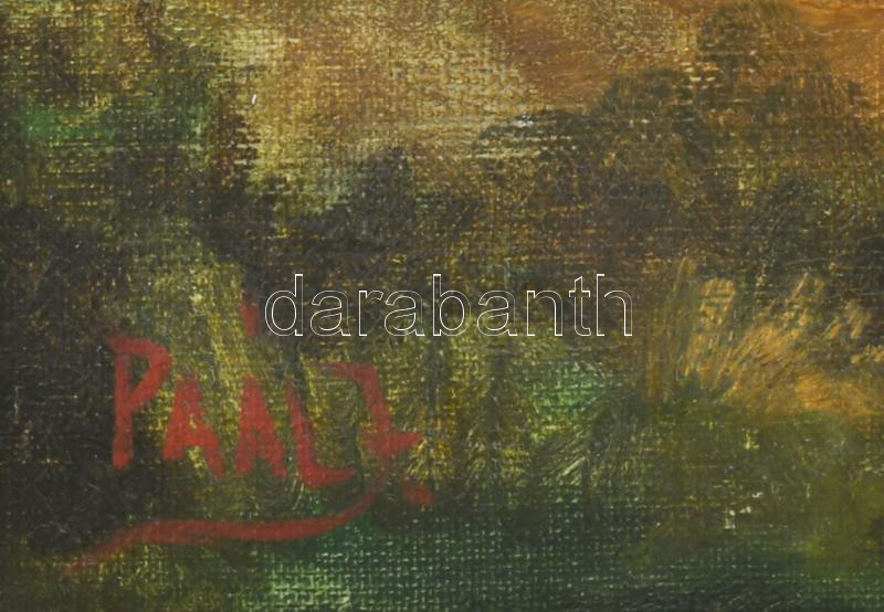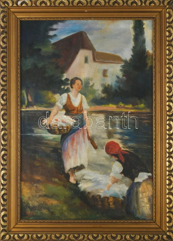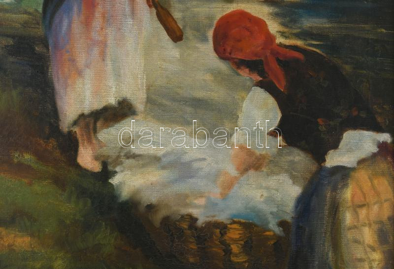 Paál J jelzéssel: Mosónők. Olaj, vászon. Dekoratív, kissé sérült fakeretben. 60×40 cm.