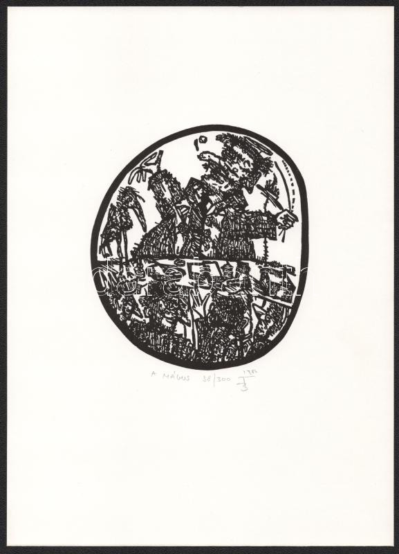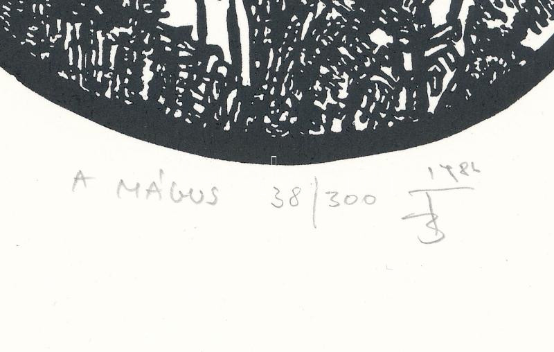 Banga Ferenc (1947-): A mágus (az 1986-ban az Újpest Galéria első kiállítására megjelent mappából). Linómetszet, papír, jelzett és számozott (38/300). 12,5x11 cm.