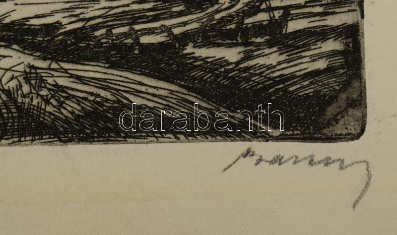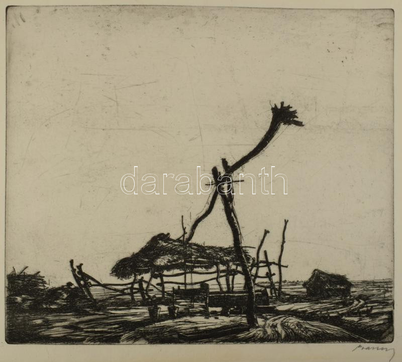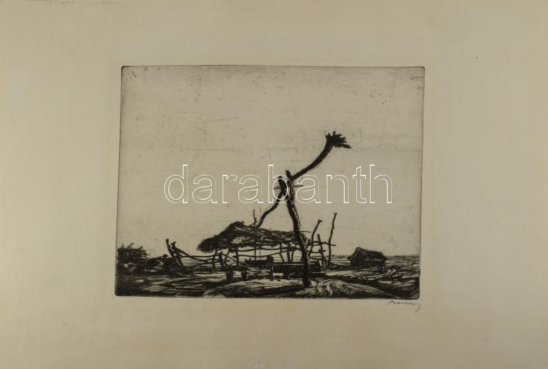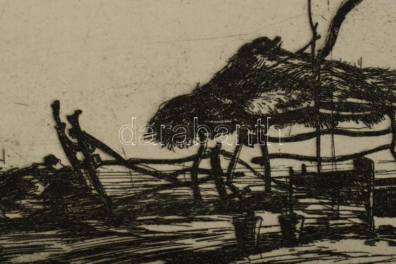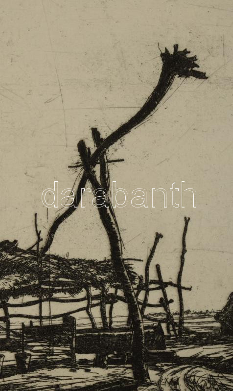 Barcsay Jenő (1900-1988): Gémeskút. Rézkarc, papír, jelzett. Egészen apró lyukakkal. 25x27 cm