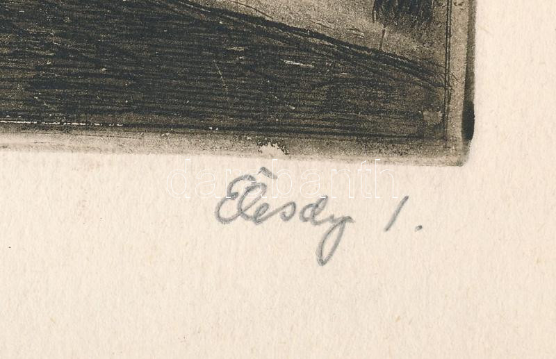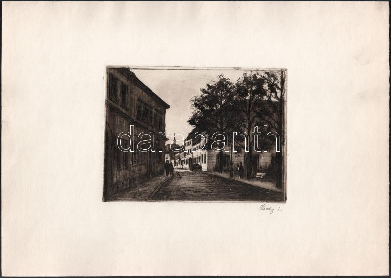 Élesdy István (1912-1987): Budavári utca járókelőkkel. Rézkarc, papír, jelzett. 14,5x19,5 cm