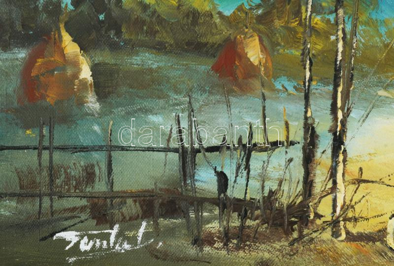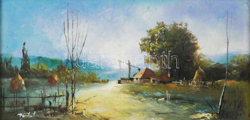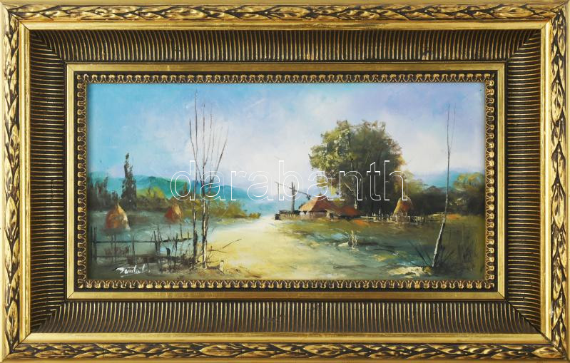 Finta László (1944-): Erdélyi tanya. Olaj, farost, jelzett. Dekoratív fakeretben, 20×40 cm