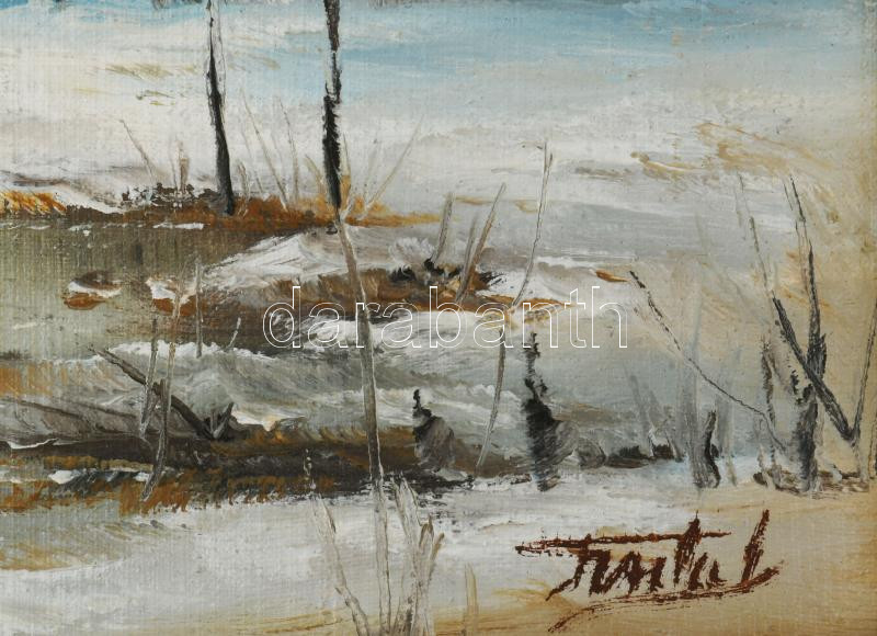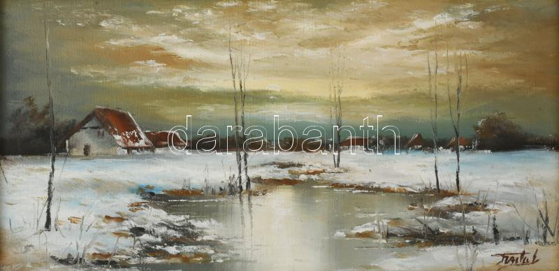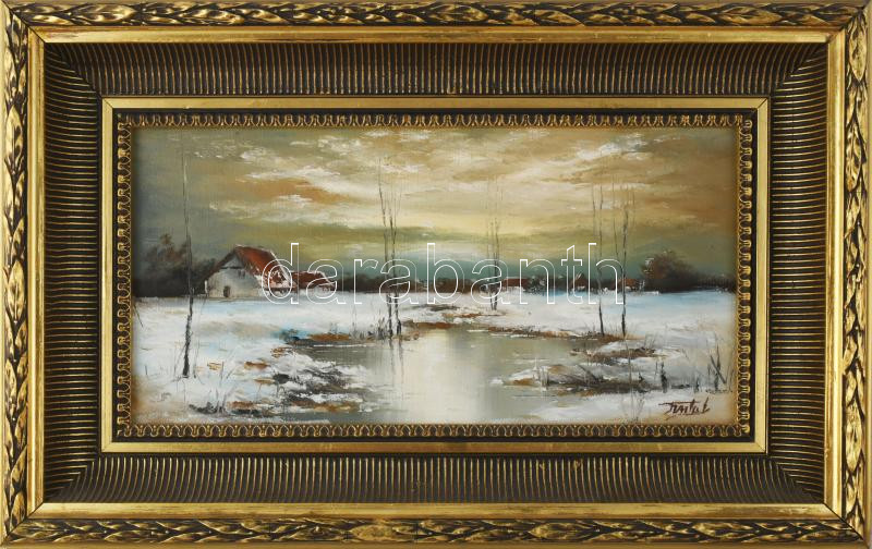 Finta László (1944-): Téli tanya. Olaj, farost, jelzett. Dekoratív fakeretben, 20×40 cm