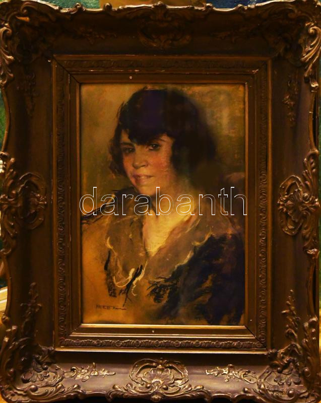Fried Pál (1893-1955): Fiatal hölgy mellképe (Milike portréja). Pasztell, papír. Jelzett. Üvegezett, dekoratív, sérült, korabeli keretben. 58x40 cm.