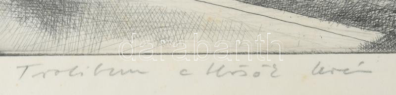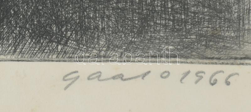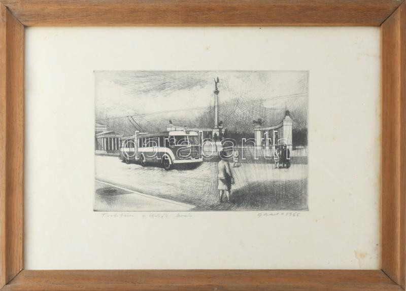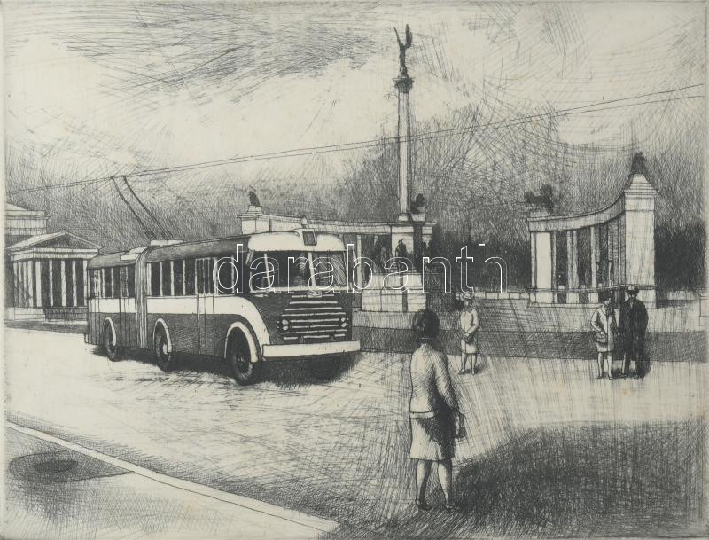 Gaál Domonkos (1940-2009): Trolibusz a Hősök terén, 1966. Rézkarc, papír, jelzett. Ázásnyomokkal, apró foltokkal. Üvegezett fakeretben, 19,5x29,5 cm