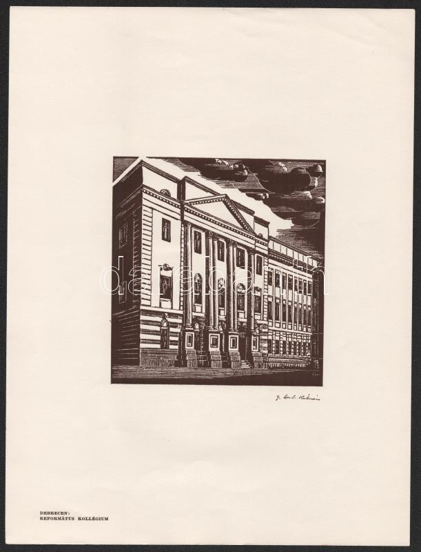 Gáborjáni Szabó Kálmán (1897-1955): A debreceni Református Kollégium épülete, fametszet, papír, jelzett a metszeten, 13×12 cm