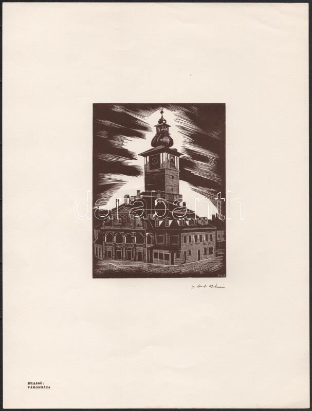 Gáborjáni Szabó Kálmán (1897-1955): Brassó. városháza. Fametszet, papír, jelzett a metszeten, 13x10 cm