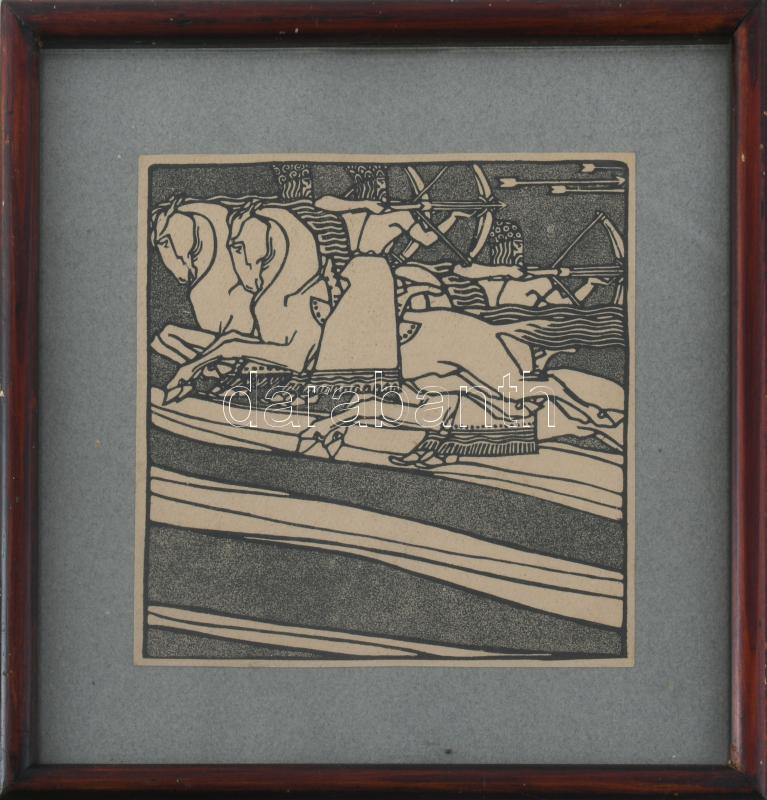 Göröntsér Greff Lajos (1888-1976): A hadak útja. Fametszet, papír, jelzés nélkül. Üvegezett fakeretben, 14×14 cm