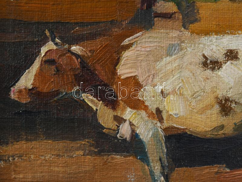 Juszkó Béla (1877-1969): Tehén, 1926. Olaj, vászon, kartonon, jelezve balra lent, dekoratív fakeretben. 13,5x20 cm