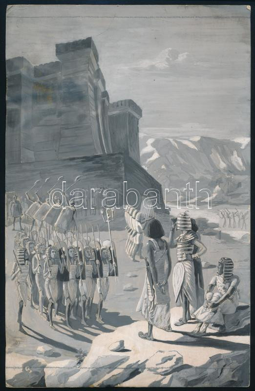 Laszgallner Oszkár (1879-1944): Egyiptomi katonák. Vegyes technika, papír, jelezve jobbra lent. Kartonra kasírozva. Kissé foltos. 28x18,5 cm