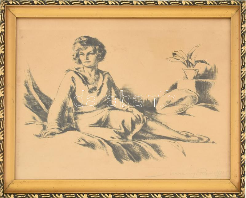 Merényi Rudolf (1893-1957): Női akt Rézkarc, papír, jelzett, üvegezett fakeretben, 19x23 cm
