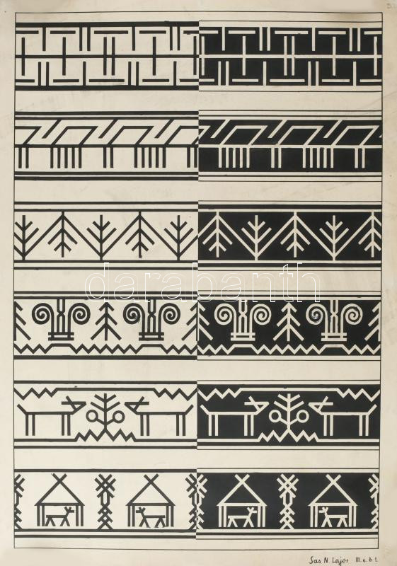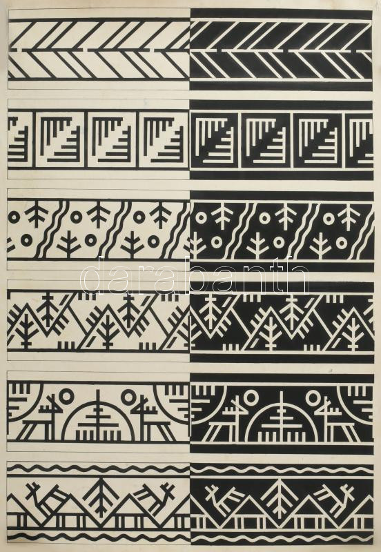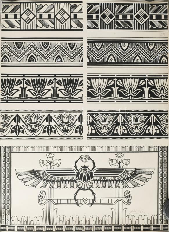 Sas N. Ljaos, Szabó J. Gusztáv (Haranghy Jenő tanítványai): Art deco, avantgárd és népies díszítő rajzok, ornamentikák. Tus, papír, jelzett. Feltekerve. 55x40 cm