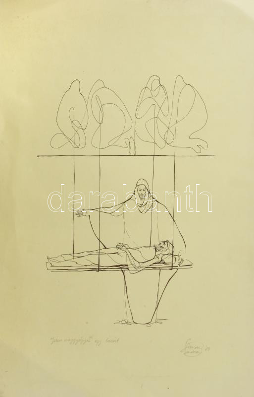 Simon András (1958-): Jézus meggyógyít egy bénát, nyomat, papír, jelzett, lapszéli hajtásnyommal, 30x23 cm