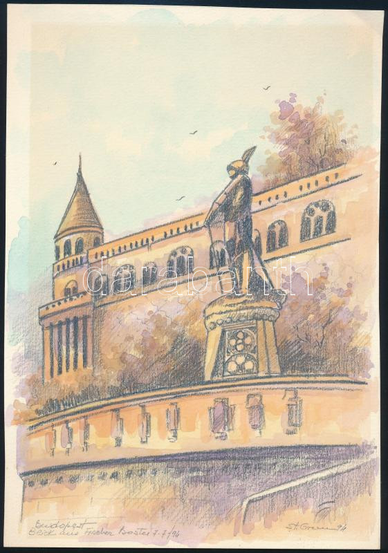 Stefan Grecu (-): Halászbástya, Budapest. Akvarell, ceruza, papír, jelzett, 25x17,5 cm