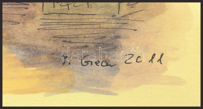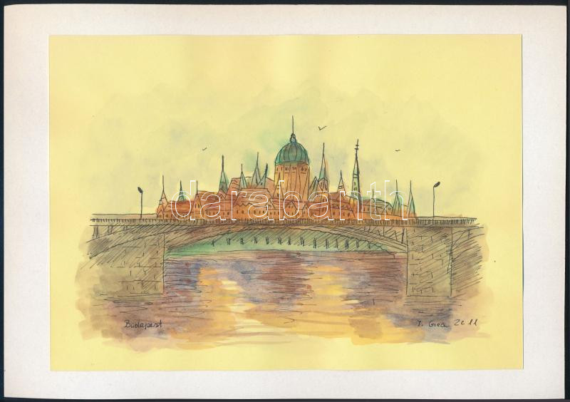 Stefan Grecu (-): Parlament, Duna és Margit híd Budapesten. Akvarell, tus, papír, jelzett, kartonra kasírozva, 15x21 cm