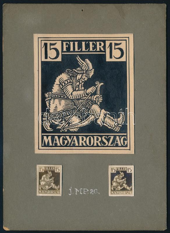 Szege Sándor (1883-1945): 15 fillér bélyeg terve, 1926 körül. Tus, papír. Jelzés nélkül. Kartonra kasírozva. 9,5x8 cm. Kartonon a kész bélyeg is szerepel!
