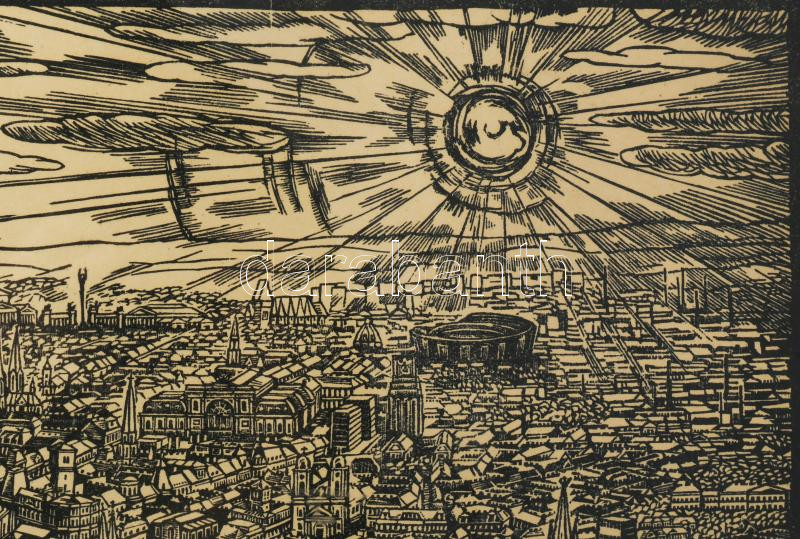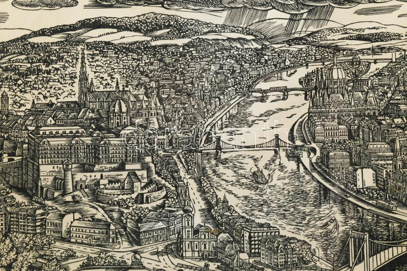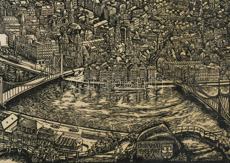 Varga Mátyás (1910-2002) Budapesti panoráma, 1965-67. Fametszet, papír, jelzett a metszeten. Lapszéli ázásnyommal. Üvegezett fakeretben. 40 x 90 cm.