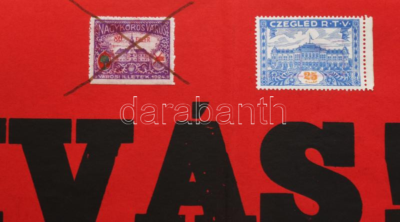 1938 Cegléd, Március 15. ünnepségek nemzetiszínű plakát, papír, tetején korabeli okmánybélyegekkel. 48x60 cm Hajtva, apró lapszéli szakadásokkal, néhány ceruzás aláhúzással, jó állapotban