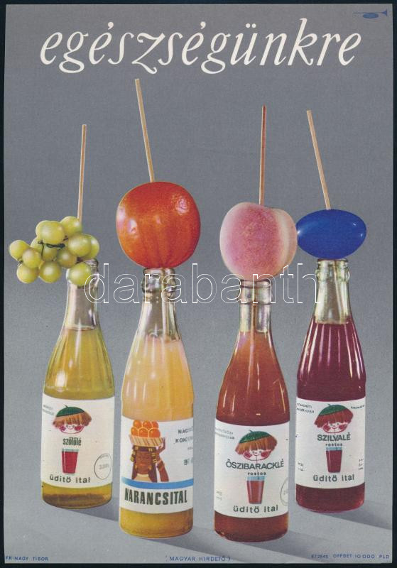 1967 Egészségünkre - üdítő ital (Nagykőrösi Konzervgyár, Kecskeméti Konzervgyár), villamosplakát, ofszet, papír, jelzés nélkül, Offset Nyomda, 23x16 cm